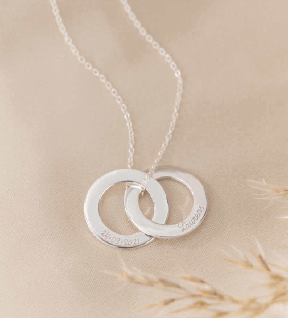 Deze persoonlijke ketting is een prachtig exemplaar. De zeer luxe uitstraling komt door de twee verstrengelde cirkels die door elkaar heen lopen. Deze ketting verstrengeld met namen symboliseert verbondenheid. Wanneer is deze ketting mooi om te geven: